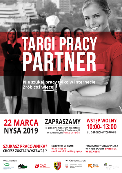 Powiatowy Urząd Pracy w Nysie i Biuro Karier PWSZ w Nysie serdecznie zapraszają do uczestnictwa w Targach Pracy „Partner 2019”, które odbędą się 22 marca (piątek) 2019 r. w godzinach 10.00-13.00 w Regionalnym Centrum Transferu Wiedzy i Technologii Innowacyjnych Państwowej Wyższej Szkoły Zawodowej w Nysie, przy ulicy Obrońców Tobruku 5.
